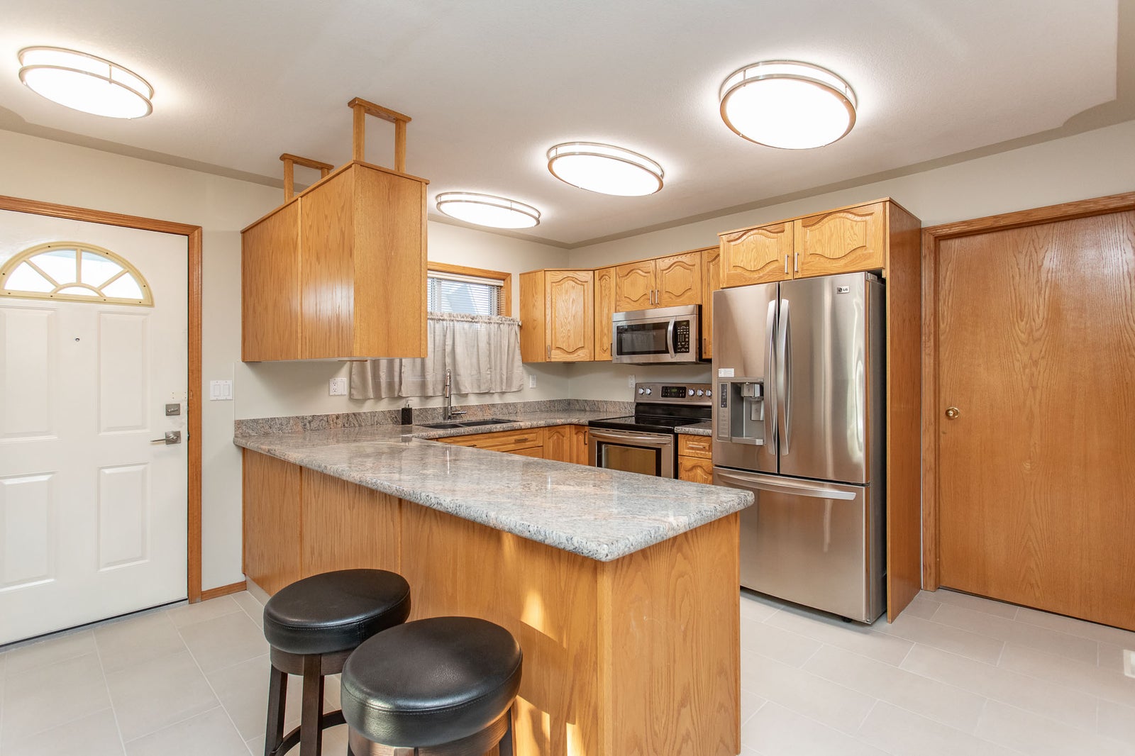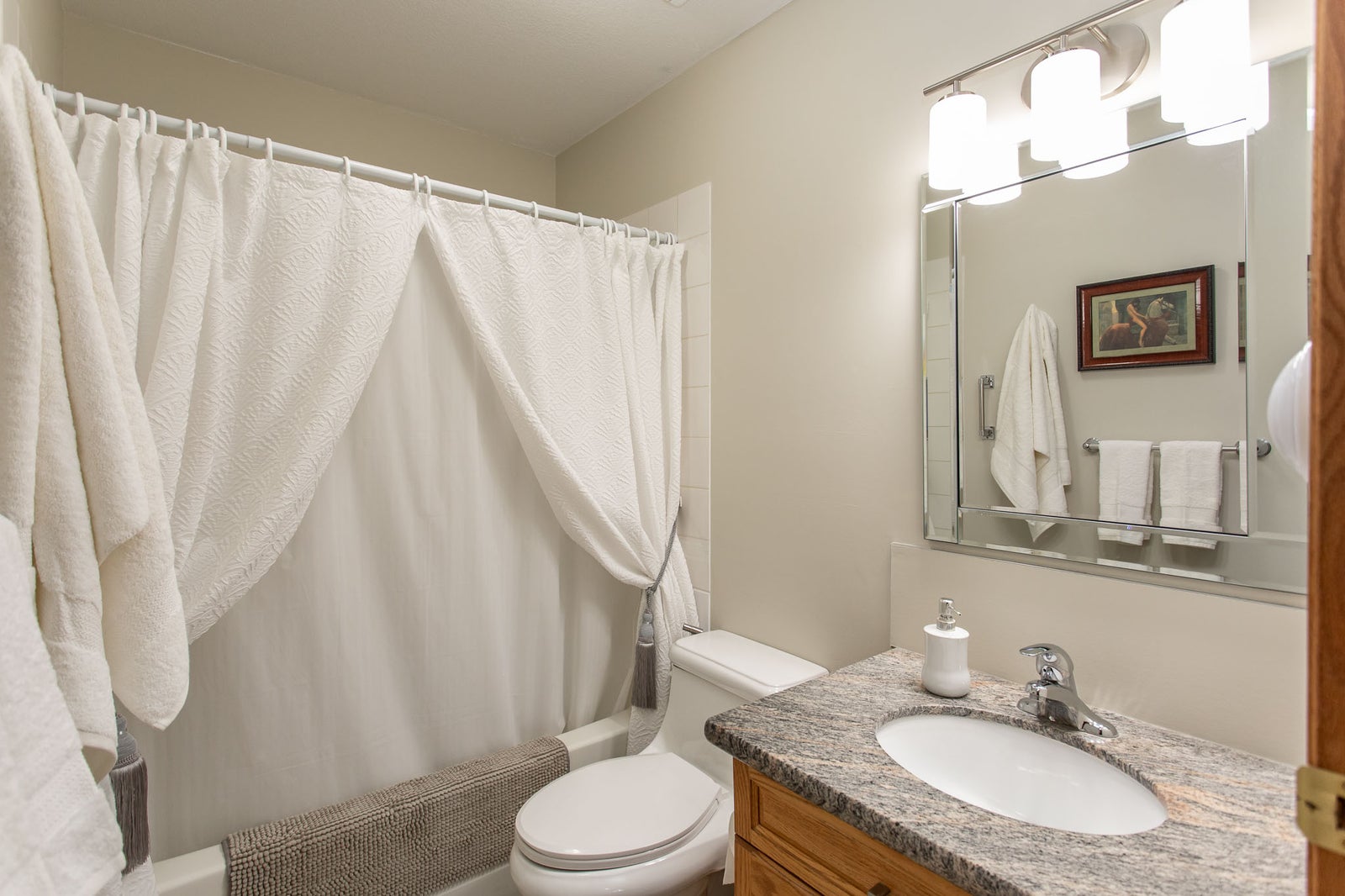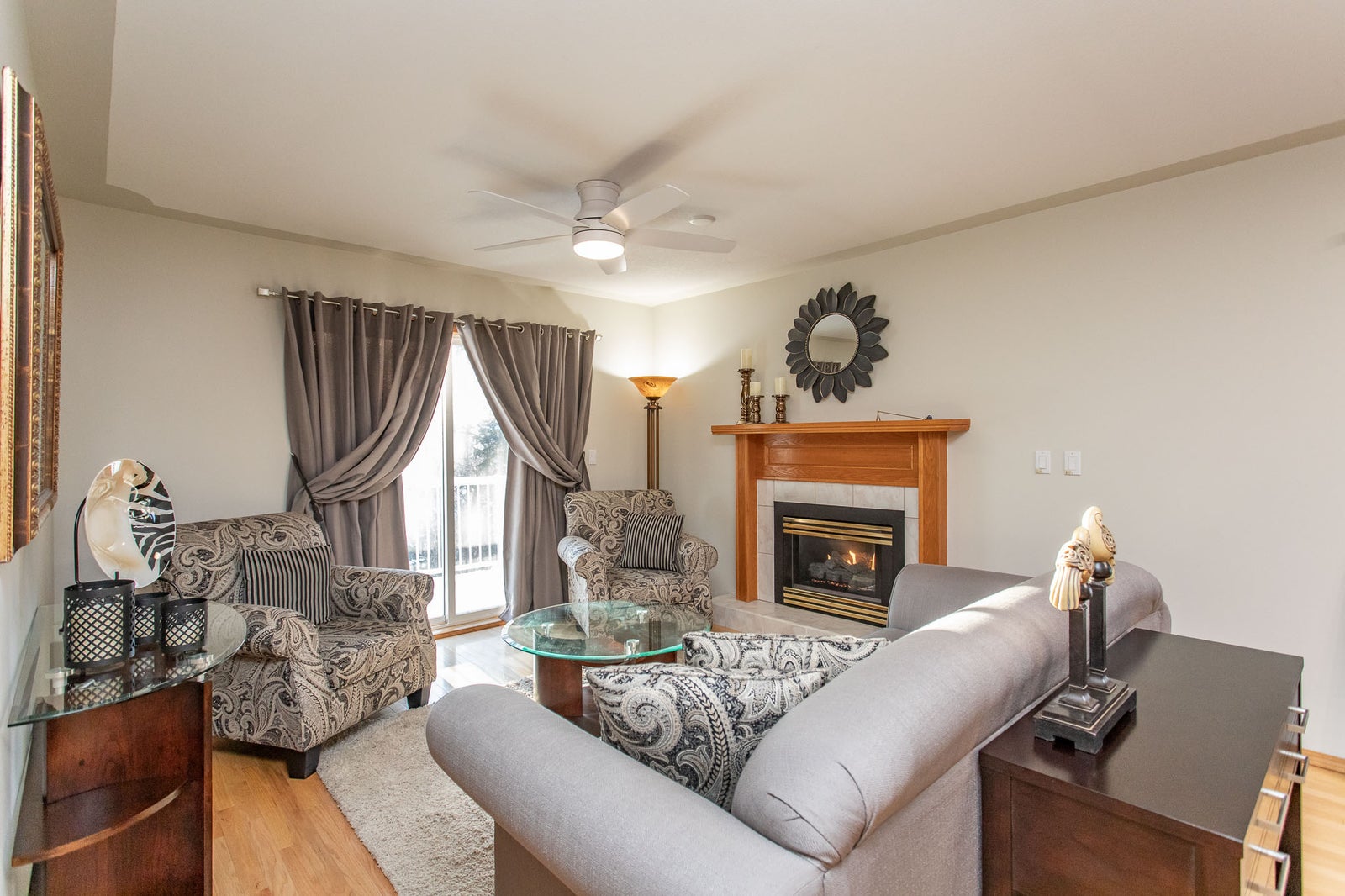 Inside, the main level is bright, open, and move-in ready. Hardwood floors, granite countertops, fresh paint, new lighting and ceiling fans, updated tile, and modern fixtures give the home a clean, welcoming feel. The kitchen offers excellent storage and flows naturally into a sun-filled dining area, while the living room is anchored by a gas fireplace and opens onto a private Duradeck balcony—perfect for enjoying the quiet surroundings.