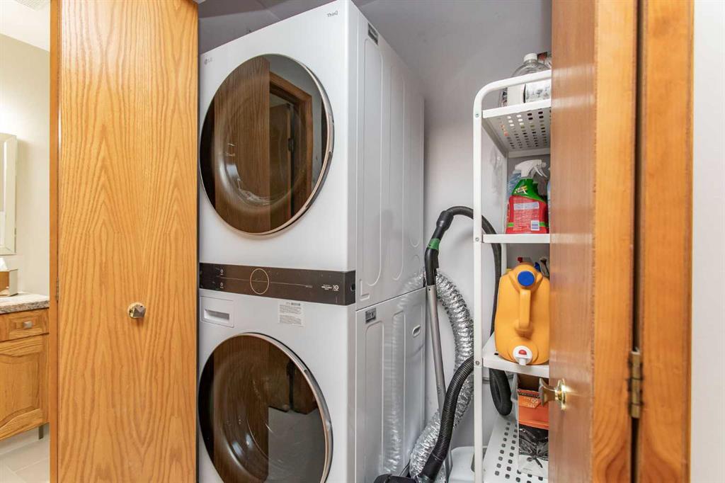 Designed for easy one-level living, the main floor includes a spacious primary bedroom with a fully redesigned walk-in closet and ensuite, along with a second bedroom that works beautifully as a home office or guest space. Main-floor laundry adds everyday convenience and includes a new, ultra-quiet stackable washer and dryer—a small detail that makes daily living noticeably more comfortable.